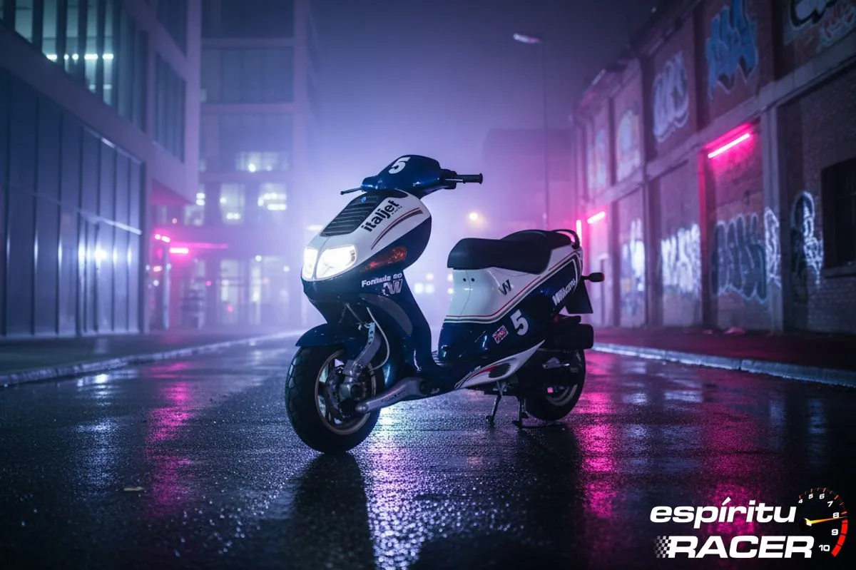 Técnicamente, Italjet tampoco se cortó. La Formula montaba un motor Minarelli horizontal de 50 cc, dos tiempos, el mismo bloque que Yamaha y MBK usaban en sus scooters más cañeros. Eso garantizaba fiabilidad y una respuesta viva, pero Italjet lo combinaba con un chasis más rígido y una geometría mucho más agresiva. El resultado era un comportamiento más cercano a una 50 deportiva que a un scooter urbano.