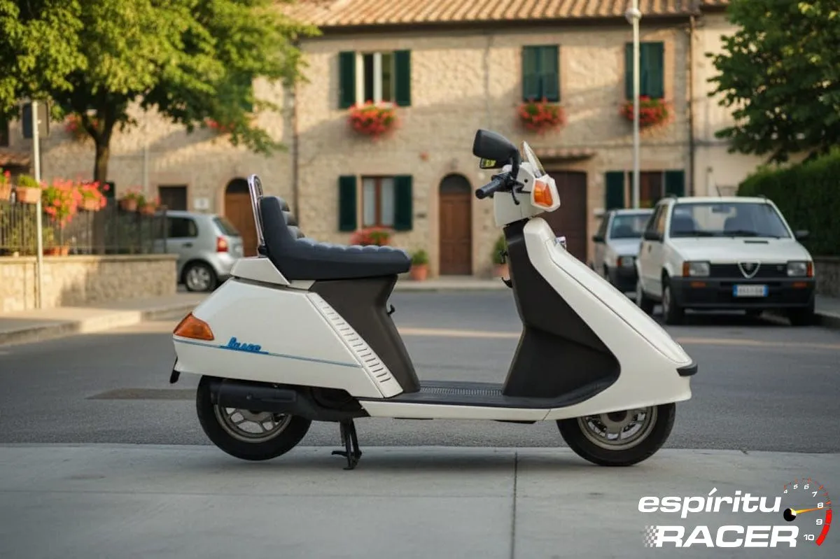 Debajo de ese envoltorio tan distinto, escondía un motor de dos tiempos y 50 centímetros cúbicos, refrigerado por aire, que rondaba los 4 CV y que movía con soltura sus apenas 51 kg en seco. Era sencilla, fiable y vivaz. El chasis, todo sea dicho, no era innovador, sino muy típico en el segmento scooter: un multitubular de acero con horquilla telescópica y un amortiguador con bieletas detrás. Los frenos eran de tambor en las dos ruedas.